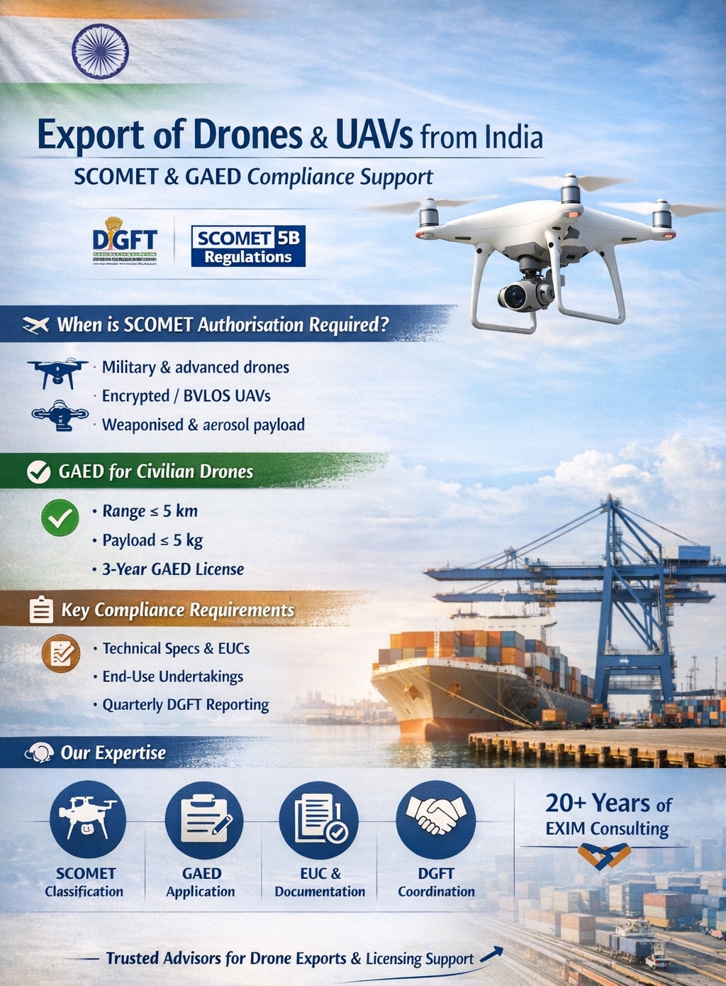 India has established itself as a significant manufacturing and innovation hub for drones and unmanned aerial vehicles (UAVs), catering to civil, commercial, industrial, agricultural, surveillance, mapping and logistics applications. With increasing global demand Indian manufacturers and exporters are actively exploring international markets. However, the export of drones from India is not a free export. It is governed by a strict regulatory framework under the Foreign Trade Policy (FTP), SCOMET regulations and national security considerations administered by the Directorate General of Foreign Trade (DGFT) in coordination with other security and technical agencies. Failure to comply with SCOMET or GAED requirements can result in export prohibition, seizure of goods, penalties, suspension of IEC and prosecution under the Foreign Trade (Development and Regulation) Act. Therefore, a clear understanding of export controls classification licensing requirements and post-export obligations is essential for any exporter dealing in drones UAVs or related technologies. This note provides a comprehensive overview of drone export regulations from India, focusing on SCOMET Category 5B, General Authorisation for Export of Drones (GAED) compliance obligations documentation and best practices.